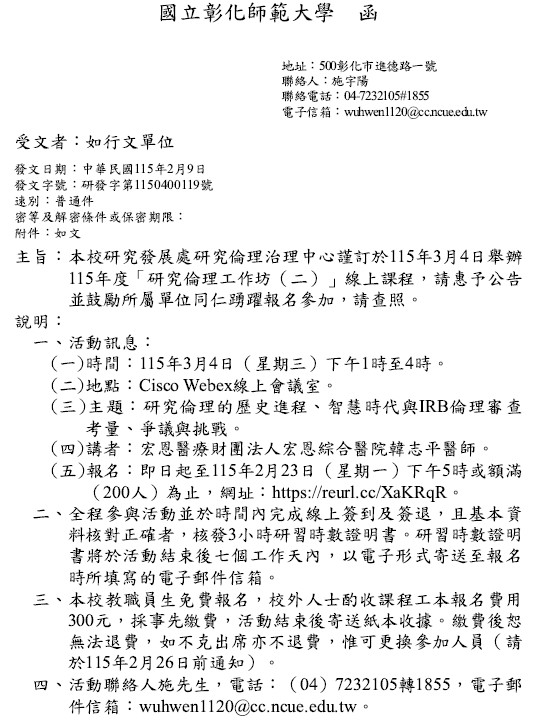 轉知:115年3月4日(三)彰化師範大學舉辦115年度「研究倫理工作坊(二)」線上課程