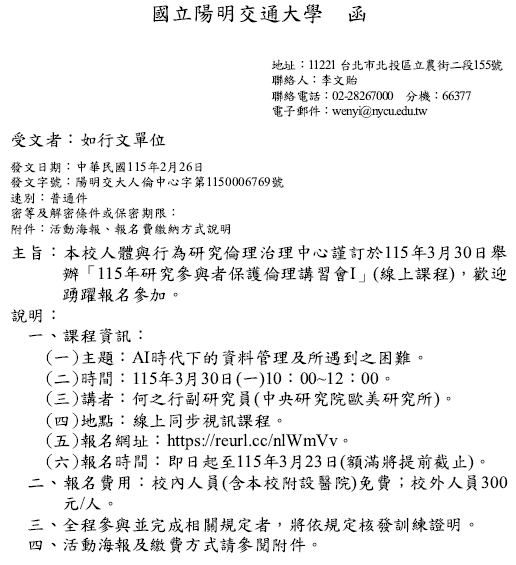 轉知:115年3月30日(一)陽明交通大學舉辦「115年研究參與者保護倫理講習會I」線上課程