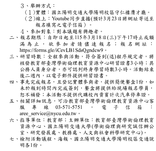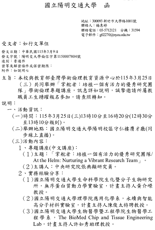 轉知:115年3月25日(三)陽明交通大學舉辦「掌舵者: 培植一個有活力的優秀研究團隊」學術倫理專題講座
